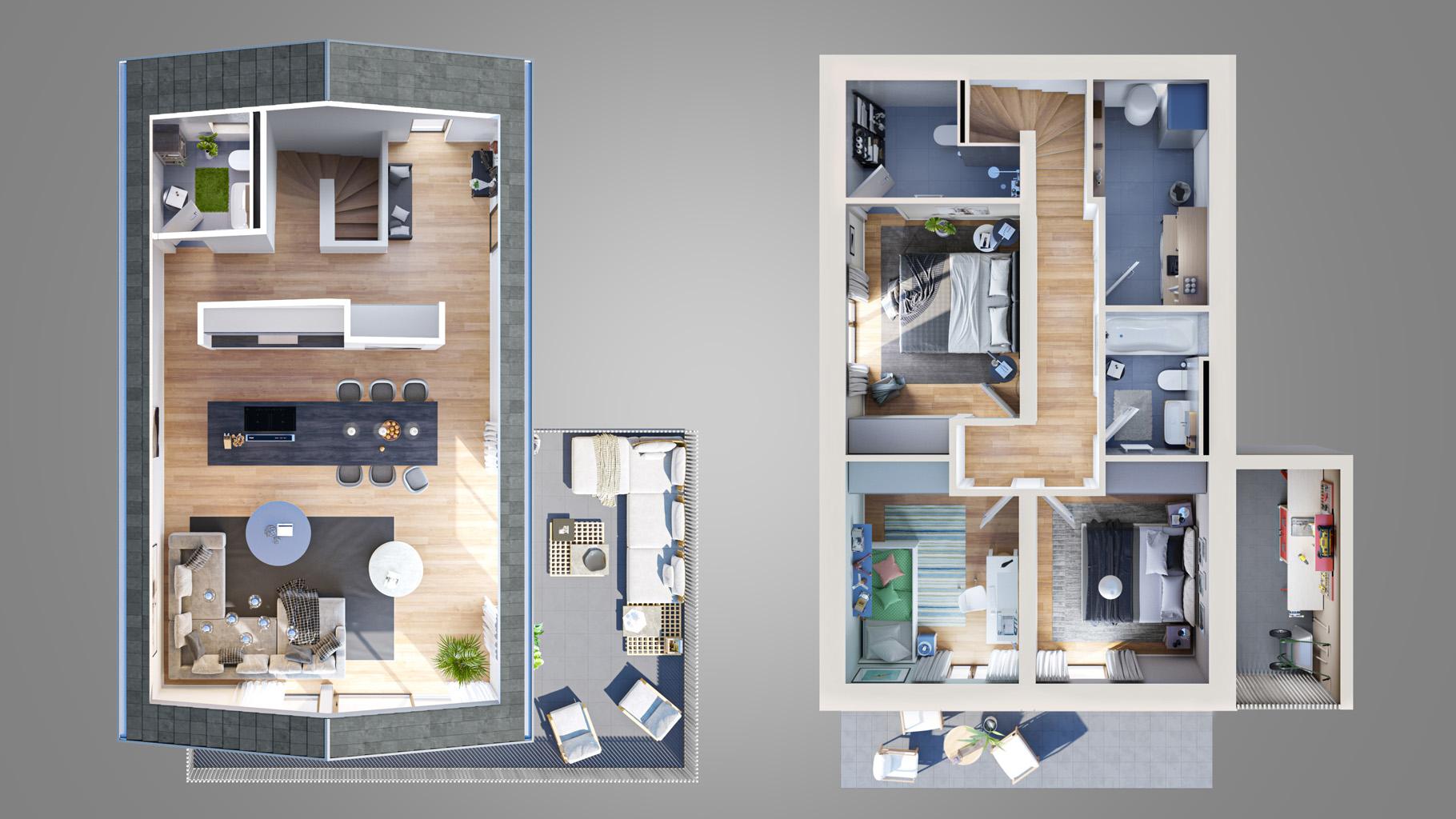Toutes les villas se composent d'une cuisine ouverte donnant sur un grand séjour lumineux ainsi que de trois chambres à coucher spacieuses dont une avec salle de bain attenante et d'une généreuse terrasse avec vue sur le lac . Deux places de parcs couvertes complètent chaque lot en sus du prix de vente.